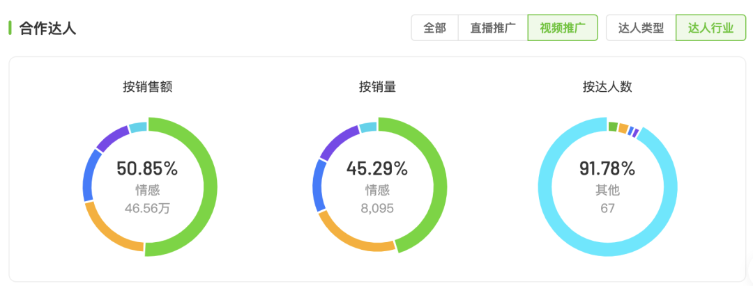 商品前期通过大量视频推送打出声量,投放账号以情感类居多。相关达人账号多以只推oralshark口腔鲨鱼为主,通过类似风格视频重复出现,同步主推品牌商品,形成刷屏规模。单 7 月的关联视频数就有 757 条。