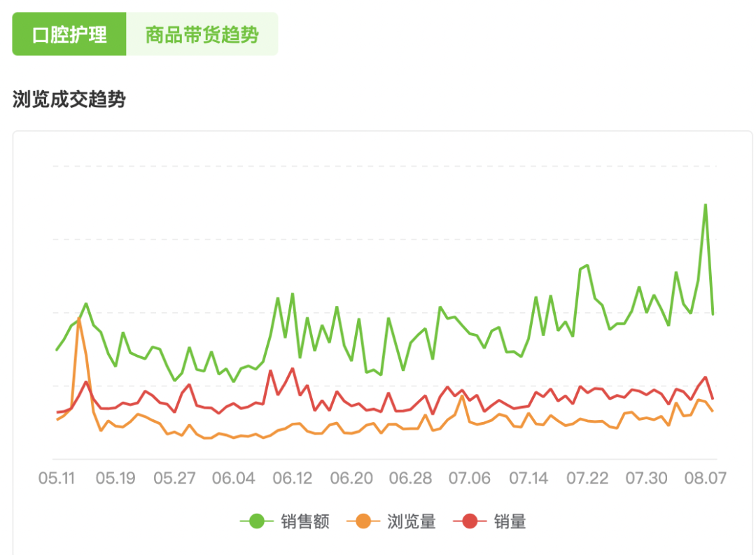 随着口腔健康意识、护理问题越来越受到关注,相关话题也频频被大家提起。从飞瓜的商品数据大盘可以看到,近几个月来口腔护理品类大盘商品在持续热卖中。