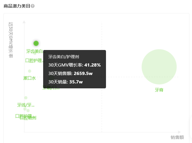 从细分类目来看,牙齿美白/护理剂 类目近 30 天有着相当高的增长表现,GMV增长率预估达41%,牙齿美白需求已经成为消费者重点关注的口腔问题,具备可观的消费潜力,这也促使部分口腔类产品的营销重点不仅涵盖“健康、护理”的内容,还新增带有“美妆“特性。