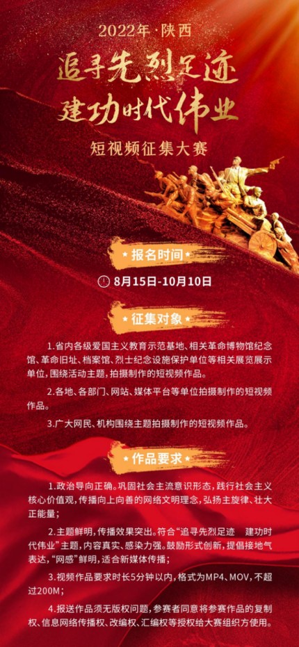 由陕西省委网信办主办、各市(区)委网信办、西安微聚信息技术有限公司承办的2022年陕西“追寻先烈足迹 建功时代伟业”短视频征集大赛于8月15日正式启动。