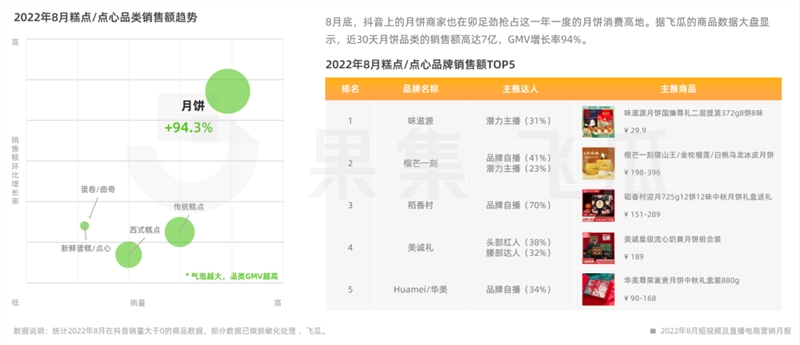 中秋节将至,月饼销量也随之攀升。根据飞瓜数据大盘提供的数据,近 30 天月饼在抖音销售额环比提升94.3%,大部分品牌提前两周通过头部红人准确投放、中腰部达人精选联盟扩大推广、自播直播间长效直播等“组合拳”进行营销。