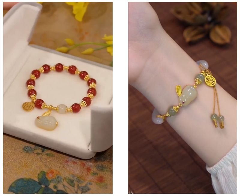 另外,除了珠宝品牌借势“玉兔”营销外,我们发现也有不少饰品商家接连上线“中秋国风玉兔福牌手链”“天然和田玉玉兔手镯”等商品,并结合 相思、红豆、Q版、礼物 等关键词进行营销,也成功捕获了 24 岁以下年轻女性的少女心。