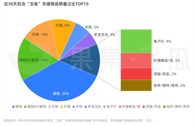 比如近期“中秋”“玉兔”等关键词的搜索热度、成交指数均有指数级提升。以“玉兔”为例,选取了近 30 天销量TOP500 的商品,颈饰/手饰等饰品类和DIY手工灯笼/兔子灯等产品占据了头部市场份额。