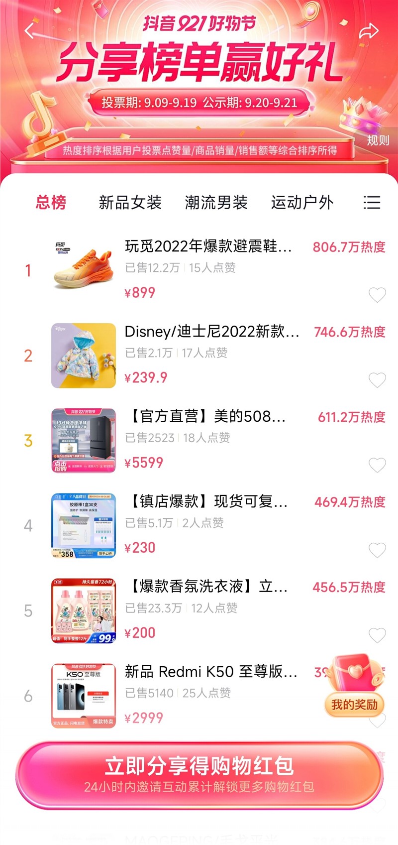 921 好物榜由根据用户投票点赞量/商品销量/销售额等综合因素排序,活动第 一天,玩觅 2022 年爆款避震鞋、迪士尼 2022 新款 90 白鸭绒三防炫彩色连帽羽绒服、美的 508 升 19 分钟急速净味双系统纤薄大容量冰箱登上好物榜前三。