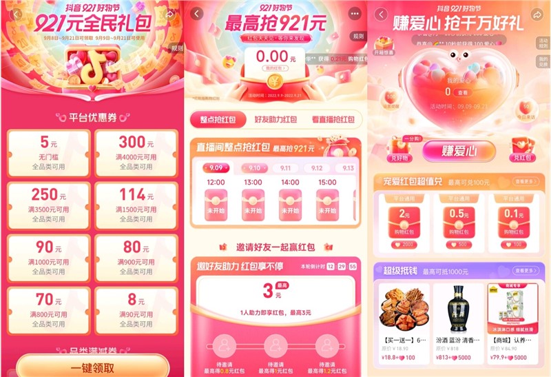 从鞋包服饰到数码电器、从食品饮料到个护家清、从美妆奢品到亲子生活,有各种各样需求的消费者都能在“抖音 921 好物节”发现让人惊喜的生活好物。抖音 921 好物节集合多样的品类商家,以超大的优惠力度、超值的消费福利,让更多消费者享受购物狂欢,活动开启当天平台通过 921 全民礼包、 921 红包天天见等活动发放平台优惠券、品类满减券,赚爱心活动兑换购物红包等等花式福利帮助消费者优惠叠加,以更实惠的价格购买心仪的物品。