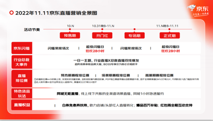 今年京东11.11,京东直播将通过“京东闪播”、“总裁价到”、“行业直播日”、“11.11超级排位赛”、“城市LIVE生活节”五大玩法,轮番上阵,让更多商家增加曝光量、提升直播转化率。