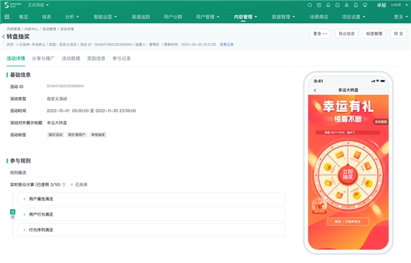 活动结束后,通过已打通权益管理模块的活动创作平台,可以为中奖用户派发相关权益,同时通过神策完整全面的数据分析能力,对此次活动进行实时分析和洞察,衡量活动带来的真实效果,推动营销策略迭代,为下次活动汲取更多可借鉴的经验。
