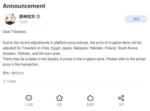 中关村在线消息:《原神》官方在HOYOLAB社区透露受平台价格政策调整的影响,或将调整部分地区的内购内容价格。受影响的地区包括智利、埃及、日本、马来西亚、巴基斯坦、波兰、韩国、瑞典、越南及欧元区。