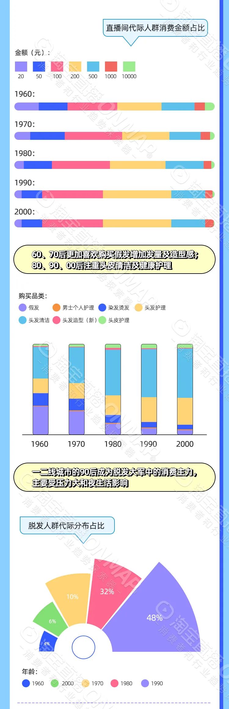 同时,各年龄段人群对产品功能的需求也各不相同,银发族喜欢购买假发,佩戴起来精致摩登又年轻,而90、00后成为养发大军,更加注重头皮清洁和护理。